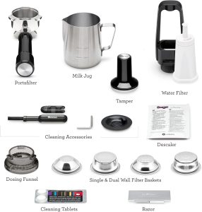 ابزار آماده سازی دوز دقیق Razor: برای تمیز کردن قهوه اضافه از پرتا فیلتر ,ابزار نظافت دستگاه ,تمپر پودر قهوه (فشاری) ,ظرف استیل مخصوص کف شیر ,فیلتر آب و نگهدارنده فیلتر آب ,یک سبد پرتا فیلتر تک شات برای پودر قهوه ,یک سبد پرتا فیلتر دو شات برای پودر قهوه |