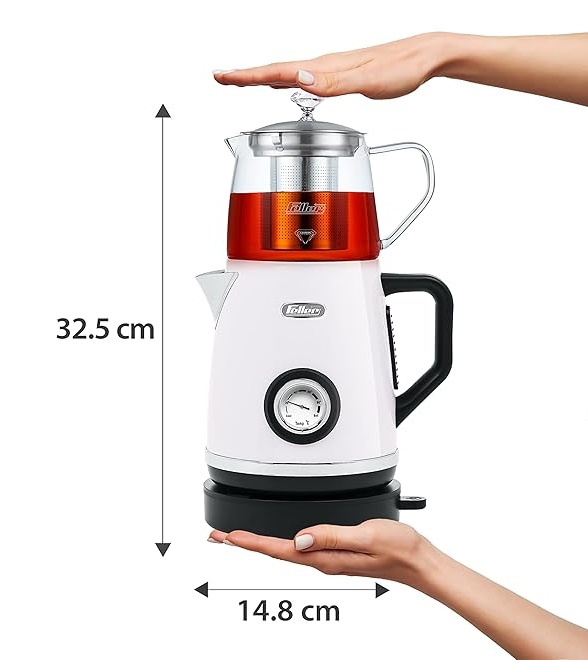 چای ساز فلر مدل TS290 دارای ظرفیت مناسبی است که برای خانوادههای متوسط و حتی مهمانیهای کوچک کاملاً کافی است. ظرفیت کتری حدود 1.7 لیتر و ظرفیت قوری شیشهای آن حدود 0.8 لیتر است. این حجم آب میتواند به راحتی برای 5 تا 7 نفر چای تازه دم آماده کند.