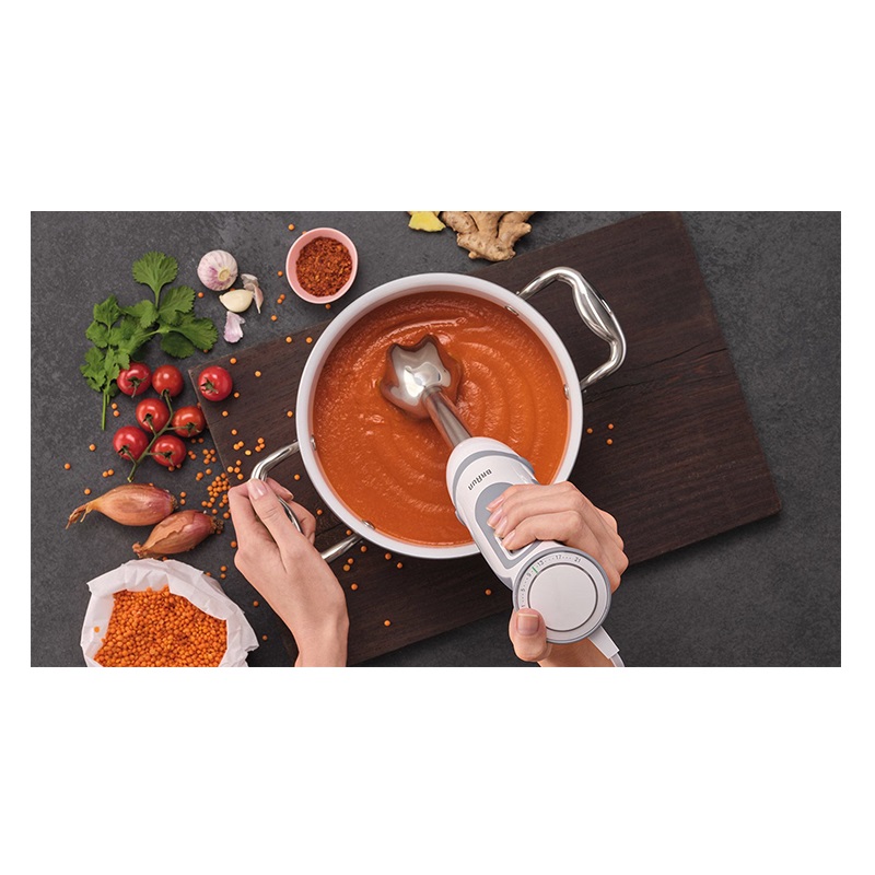 شرکت براون در ساخت گوشت کوب MQ5245WH از تمامی نکات طراحی ارگونومیک استفاده کرده است تا کار با این محصول را برای شما آسانتر و دلنشینتر کند. بهکارگیری بدنهای پلاستیکی در کنار یک دسته نرم با پوشش ضدلغزش حداکثر کنترل دستگاه را در حین انجام فرایندهای مختلف برای شما مقدور میسازد. قسمتی از دستگاه که باید در دست نگه دارید باریکتر طراحی شده تا در هنگام نگه داشتن در دست و فعالیت با گوشت کوب برقی تسلط کافی را روی فرایند موردنظر داشته باشید. کنترل پنل این محصول به گونهای طراحی شده تا به سادگی و تنها با اشاره یک انگشت، امکان ایجاد تغییر در سرعت عملکرد دستگاه وجود داشته باشد.